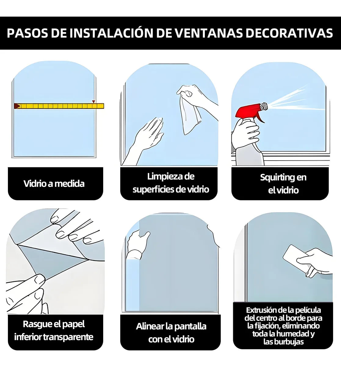 Solo rocía agua con jabón, coloca la película y alisa la superficie. No requiere profesionales ni obra.