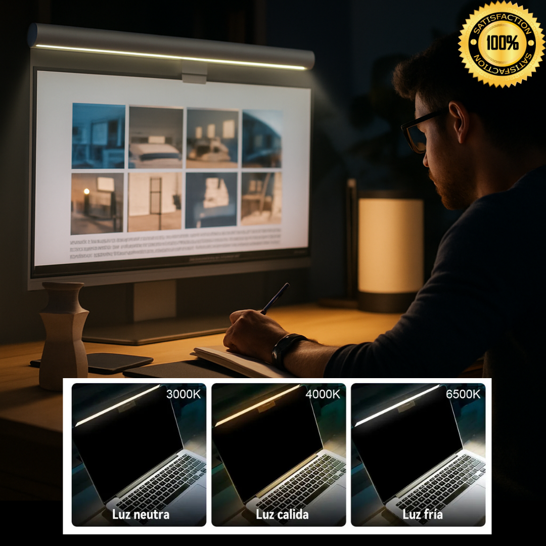 Iluminación suave y sin deslumbramientos: La lámpara emite una luz uniforme y suave que reduce los deslumbramientos y la fatiga ocular, brindando una experiencia visual cómoda para largas sesiones frente a la pantalla, ideal para trabajar, estudiar o disfrutar de entretenimiento sin causar molestias a la vista.